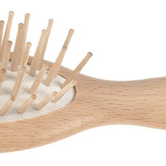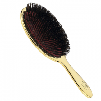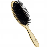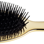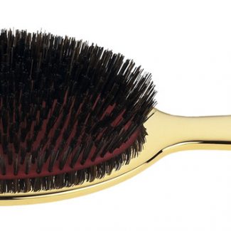 Escova dourada com pinos de silicone. Ideal para desembaraçar e pentear, mantendo a estrutura dos fios. Comprimento: 22,5 cm.